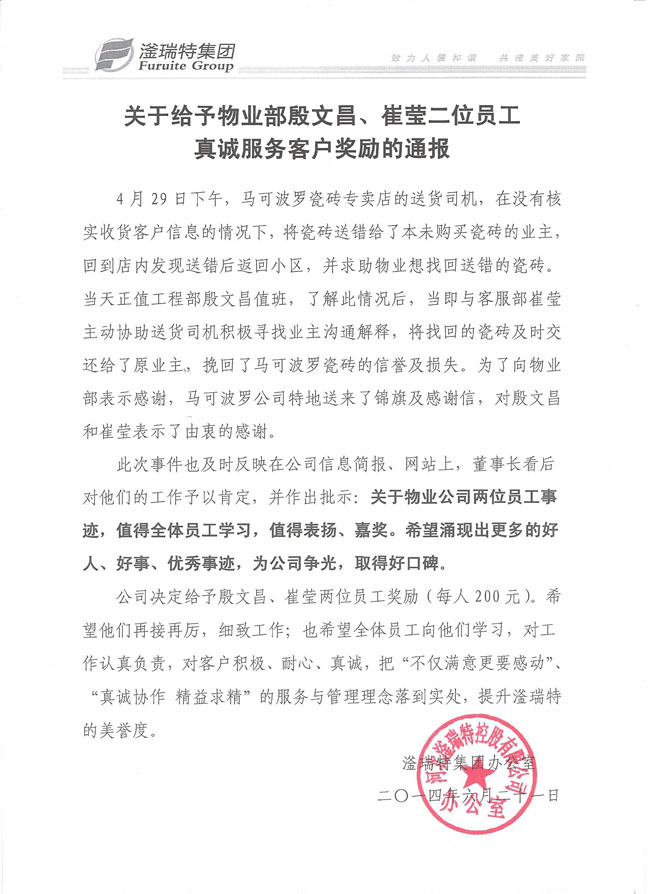 關于給予物業部殷文昌、崔瑩二位員工真誠服務客戶獎勵的通報